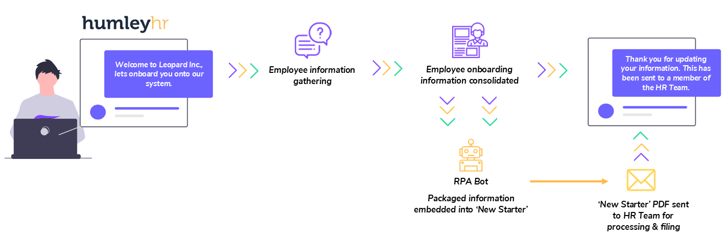 For example, in collaboration with RPA bots, a Conversational Assistant can guide new employees through a series of questions to gather information relating to the fields within a new starter form. These forms include questions such as name, address, financial and payroll information, eligibility to work, etc., and are usually sent to the employee via an email attachment, often requiring them to print and scan the document to return it.